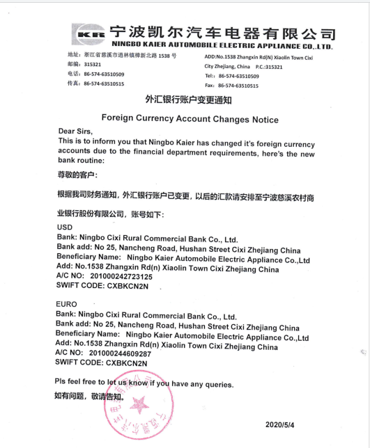 尊敬的客戶: 根據(jù)我司財務通知,外匯銀行賬戶己変更,以后的,以后的匯款請安排至寧波慈溪農(nóng)村商業(yè)銀行股份有限公司